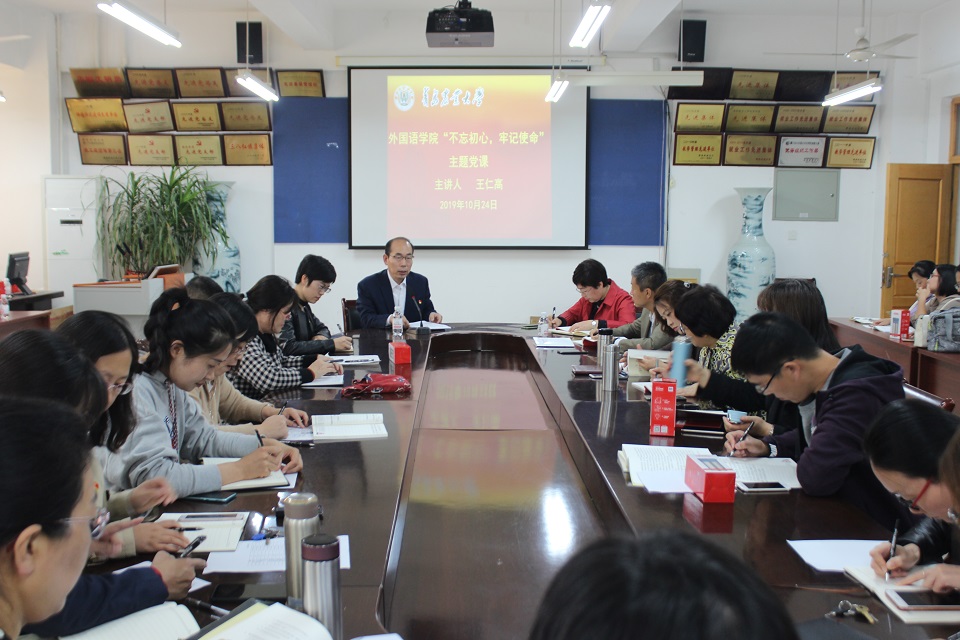 根据校“不忘初心 牢记使命”主题教育工作要求,10月24日下午,外国语学院党委书记王仁高以“坚持问题导向,努力提高人才培养质量”为题,结合调研情况和学生成长评价报告,为全院教职工党员党课。学校“不忘初心、牢记使命”主题教育指导组成员丛鹏出席。学院非党员教师参加了党课。