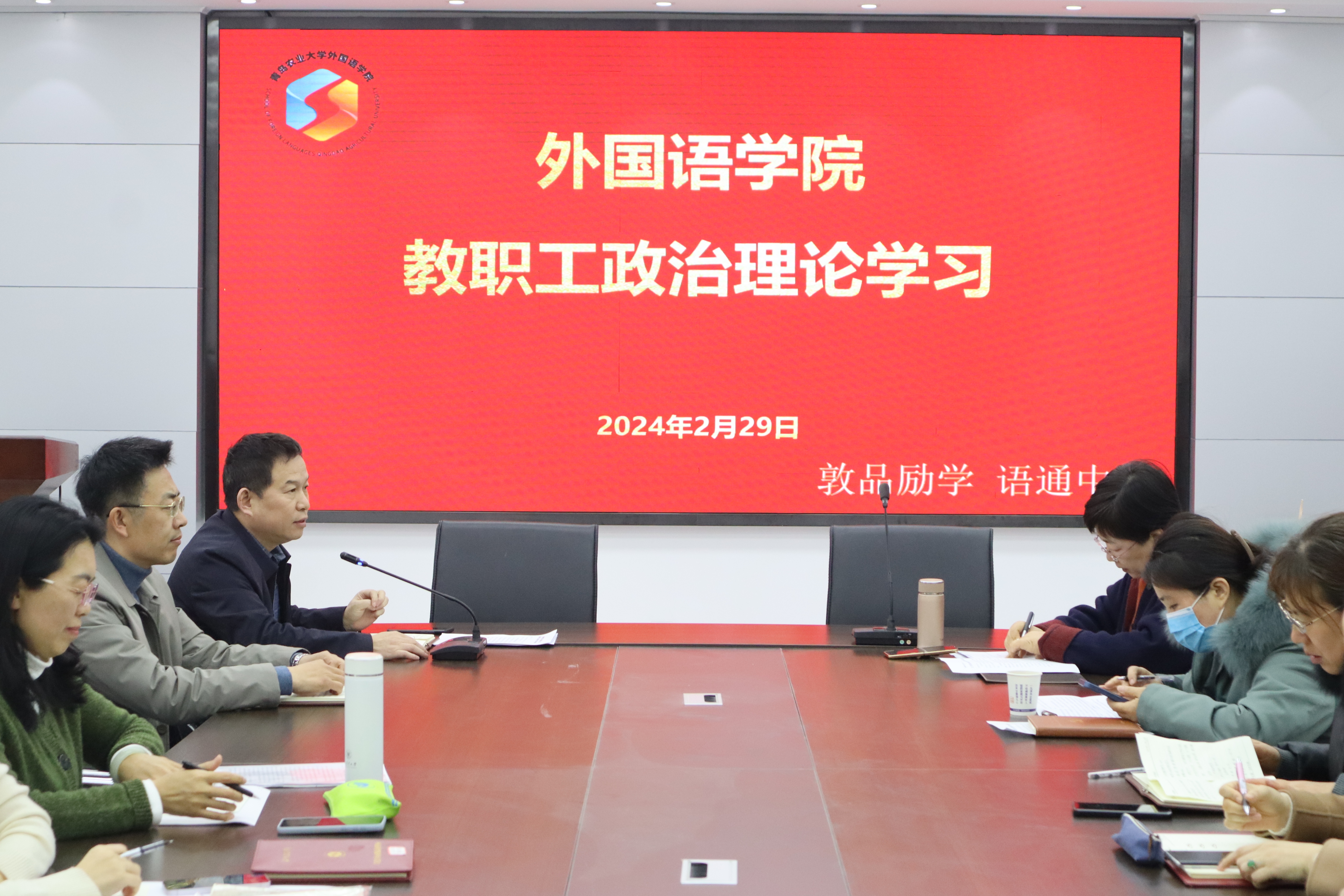 2月29日,外国语学院于文经楼C220会议室召开教职工政治理论学习及新学期工作部署会。会议由外国语学院党委书记王效仿主持,学院院长纪卫宁、党委副书记副院长盛金玉、副院长李春梅及全体教职工参会。