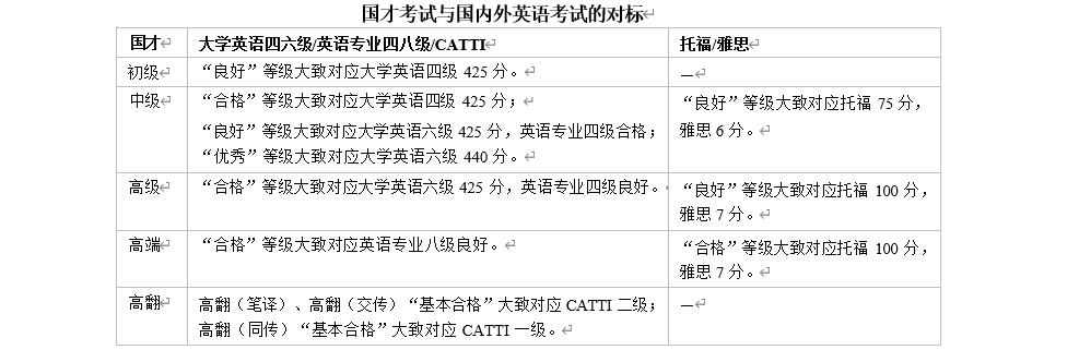 国才考试为标准参照性考试,不设置通过率。考生成绩只要达到相应等级标准,即可获得该等级证书。国才初级、国才中级、国才高级、国才高端的考试成绩分为优秀、良好、合格、不合格四个等级,成绩达到合格及以上者,方可获得证书。国才高翻的考试成绩分为优秀、合格、基本合格、不合格四个等级,成绩达到基本合格及以上者,方可获得证书。