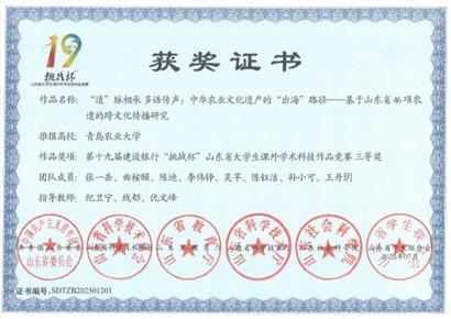 “挑战杯”竞赛作为大学生关注度最高的全国性赛事之一,被誉为中国大学生创新创业的“奥林匹克”。在本届山东省赛中,外国语学院学生团队项目《“遗”脉相承 多语传声:中华农业文化遗产的“出海”路径——基于山东省46项农遗的跨文化传播研究》,荣获省级三等奖。该项目充分结合外语专业优势,展现出了较强的创新能力和跨学科研究水平。