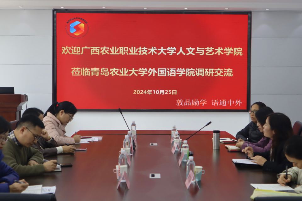 10月25日,广西农业职业技术大学人文与艺术学院副院长宁静一行四人到访kaiyun体育官网外国语学院,就一流课程建设、课程思政建设、教材建设、师资队伍提升、品牌建设以及英语专业校企合作、产教融合等工作进行调研交流。外国语学院李春梅副院长、大学英语教学部主任聂庆娟、王珍以及英语系副主任姚雪丽参加。