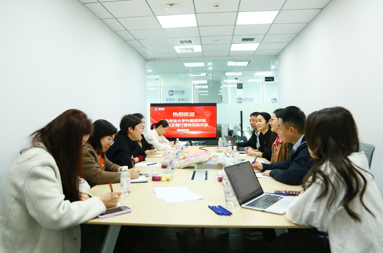 2025年11月11日上午,外国语学院院长纪卫宁、副院长高秀雪、学院团委书记线郁、学院MTI中心主任姚雪丽以及研究生代表赴新航道青岛学校开展访企拓岗活动。新航道青岛学校副校长文雅丽、人力总监张丽丽、市场总监黄广起、市场经理龚佳祺全程陪同。