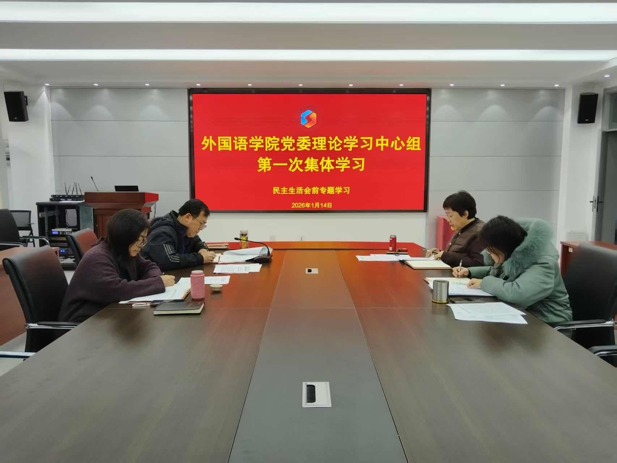 1 月 14 日,外国语学院在文经楼C220会议室举行2026年党委理论学习中心组第一次集体学习暨民主生活会前专题学习,外国语学院党委书记王晓雷主持,学院党委委员参加。