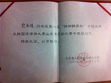 2016、2017连续两年获得山东省大学生韩国语话剧大赛二等奖